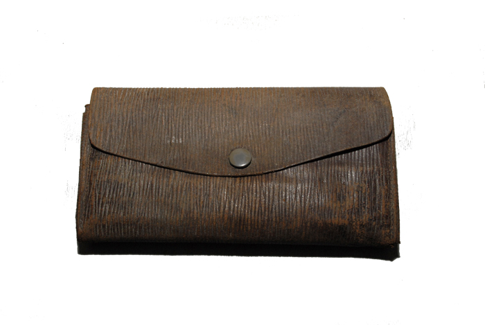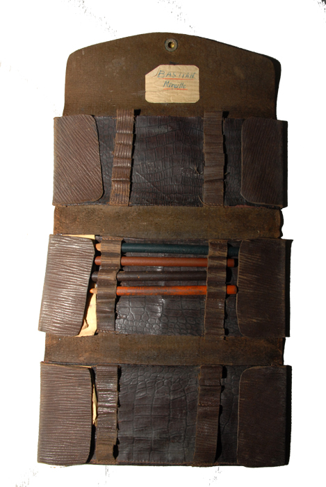 Trousse assortie Année 50 Cuir travaillé façon strié Largeur : 19,5 cm Hauteur : 10,5 cm Ouverte à plat : 37 cm Intérieur façon croco avec 3 compartiments pour les crayons Avec 3 crayons de couleur